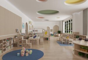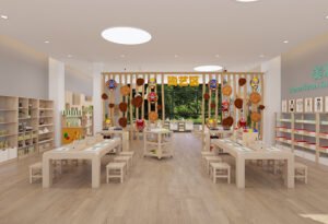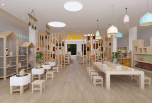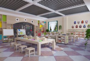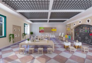 Kindergarten Preschool Montessori Daycare School Drawing Area Wooden Tables and Chair