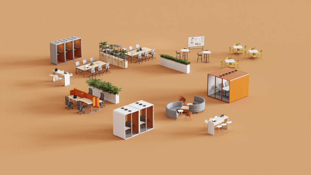 - Acoustic Pods & Phone Booths – Offering privacy in open workspaces.